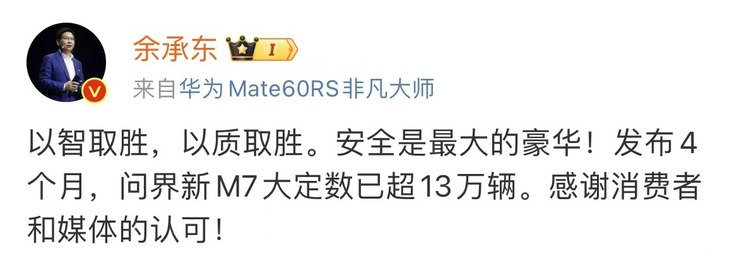 [本站 资讯]日前,华为智能汽车解决方案BU董事长余承东在社交媒体上表示,发布4个月,新款问界M7大…