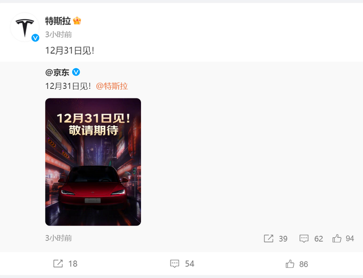 [本站 资讯] 12月25日,京东官方微博发布宣传海报配文“12月31日见”并@特斯拉官…