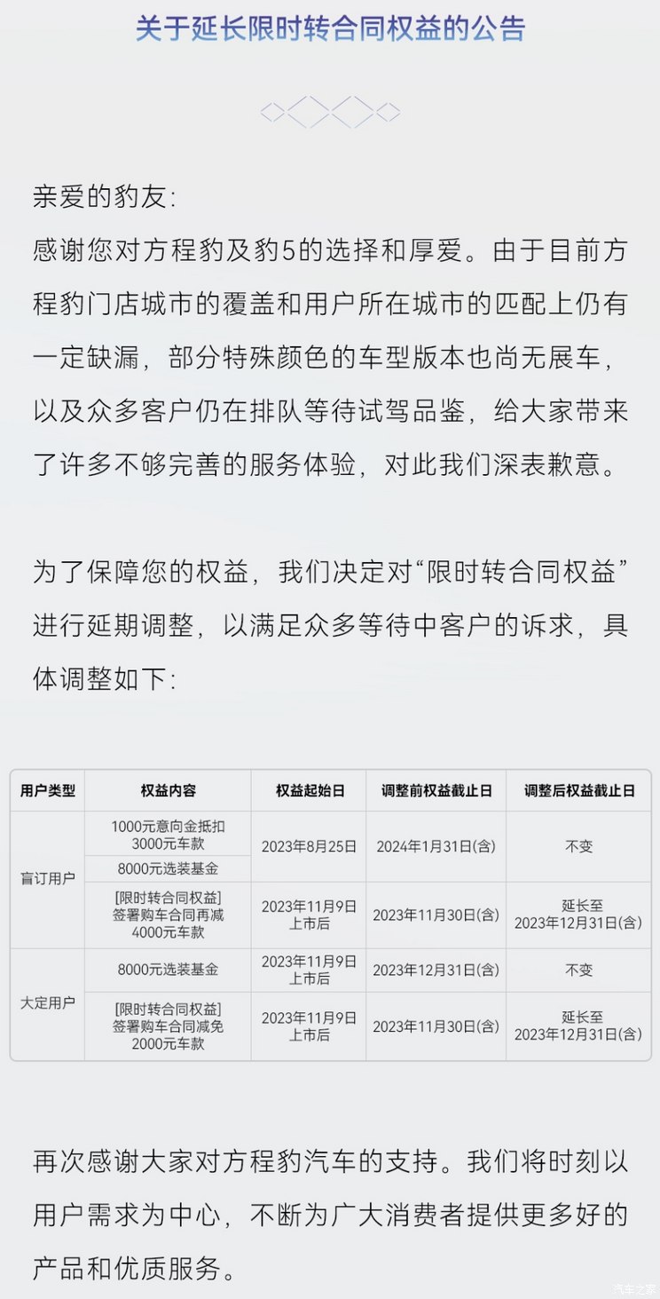 [本站 资讯] 日前,方程豹汽车发布公告称,由于目前方程豹门店城市的覆盖和用户所在城市的…