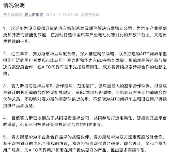 [本站 资讯] 11月26日晚间,赛力斯通过微信公众号发布情况说明,称赛力斯目前是华为车BU合作最…