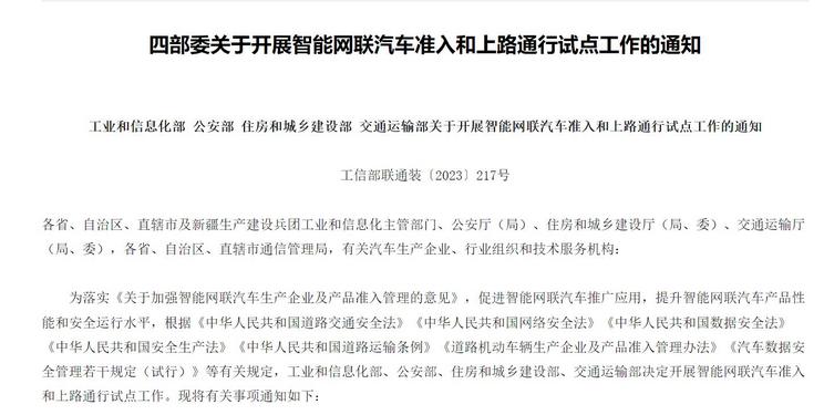[本站 资讯] 11月17日,《工业和信息化部 公安部 住房和城乡建设部 交通运输部关于开展智能网联汽车准入和…