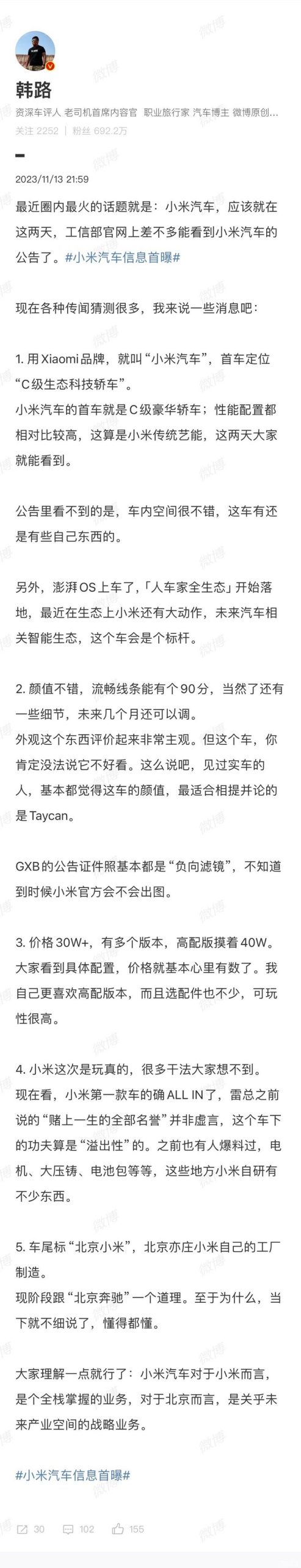 [本站 资讯] 日前,知名汽车博主在其微博曝光了小米汽车首款产品的相关信息,这款车将定位30万+。…
