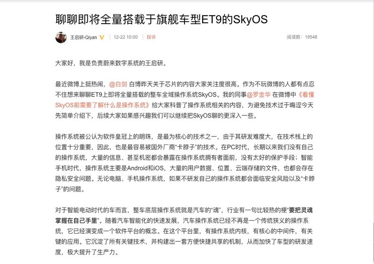 [本站 资讯] 12月22日,蔚来数字系统副总裁王启研在国内社交平台处表示,蔚来整车全域…