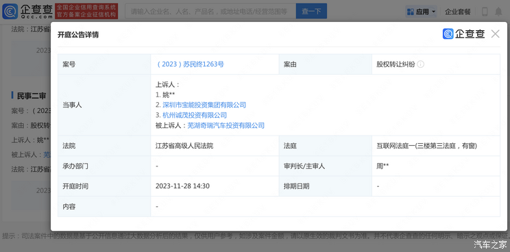 [本站 资讯]日前,据企查查显示,芜湖奇瑞汽车投资有限公司新增一则二审开庭公告信息,上诉人为姚振华、…