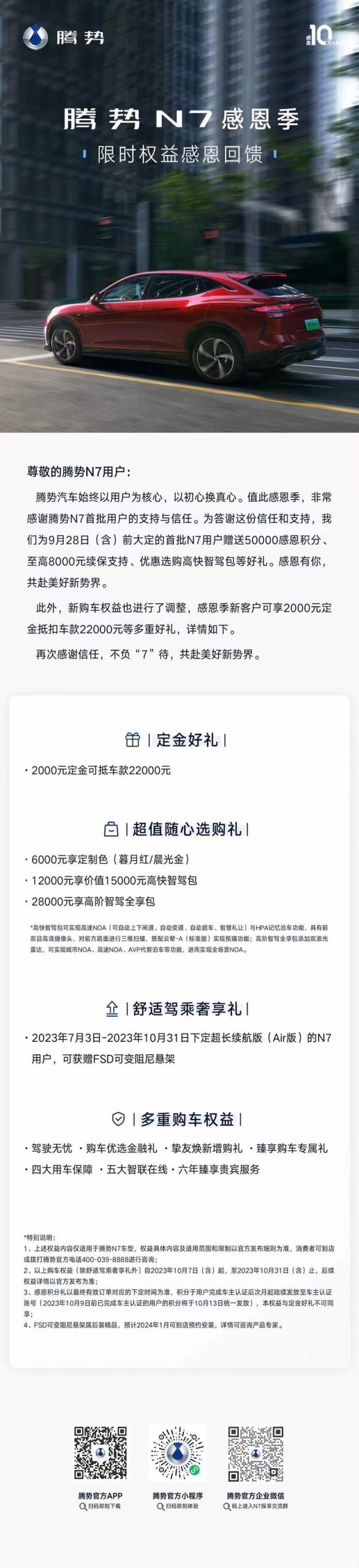 [本站 资讯] 10月11日,腾势官宣N7感恩季新权益。针对首批客户,在此之前有膨胀金777元抵5…