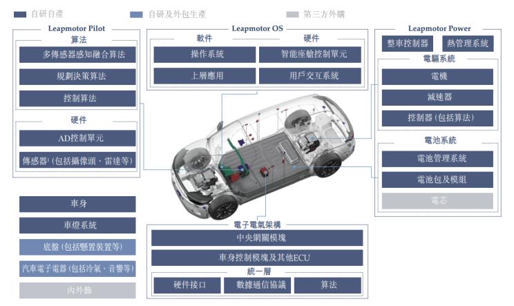 除电芯、内外饰外购,底盘、汽车电子电器为自研及外包生产外,其它所有零部件均为自研自产。目前,零跑已实现整车成本70%的自研自造,成为目前国内造车新势力中唯一具备全域自研能力及垂直整合度最高的智能电动车企,并且成功实现智能电动汽车所有核心系统和电子部件的自主研发设计与生产制造,打造了智能动力系统(Leapmotor Power)、智能驾驶系统(Leapmotor Pilot) 及智能座舱系统(Leapmotor OS)。