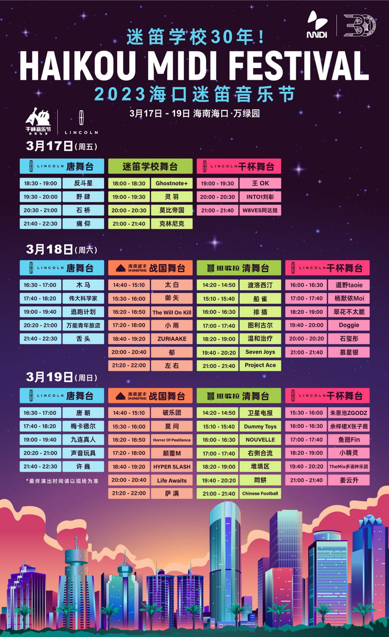 与以往不同的是,今年的2023海口迷笛音乐会,正值迷笛学校30年,拥有着特殊的含义。因此,在乐队阵容上也是堪称豪华,从海报上来看,上面所列出来的一串串名字确实令人难以掩饰激动之情。而在唐、清、战国、干杯、学校舞台上,最最豪华的当数林肯赞助的唐舞台。