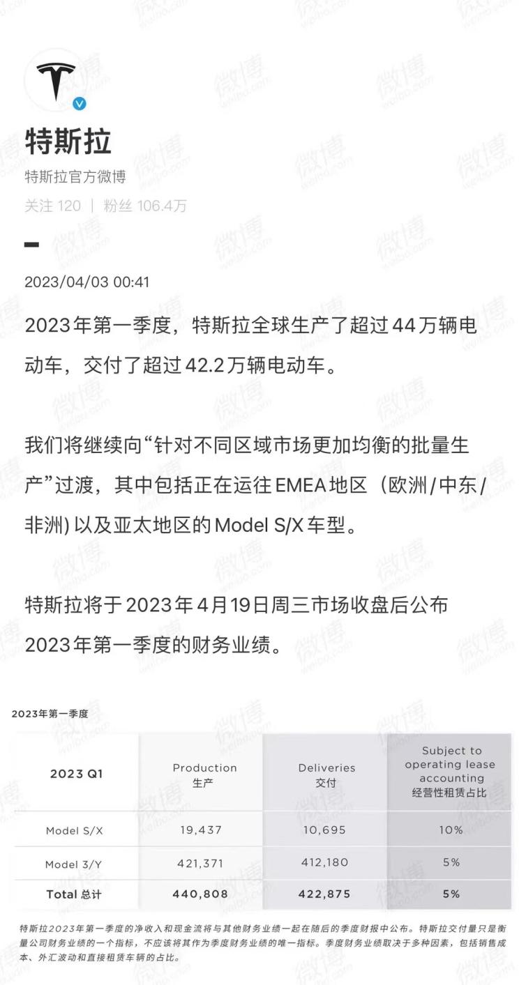 [本站 资讯] 4月3日,特斯拉官方公布其2023年一季度交付成绩。具体来看,特斯拉全球生产了超过44万辆电动车,交付了超过42.2万辆电动车。同时,特斯拉将于2023年4月19日周三市场收盘后公布2023年第一季度的财务业绩。