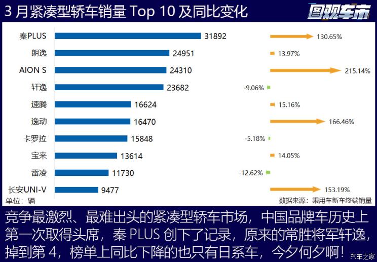 消费面,根据乘用车终端销量数据,3月国内新车销量166.55万辆,拜价格战所赐,比惨淡的2月份大幅增长28.72%,同比亦增长了11.09%。其中燃油车销量112.5万辆,环比增长25.27%,新能源车销量54.06万辆,环比增长36.58%――这一part,燃油车看上去竟是输了。而具体到各细分市场看,不少燃油产品依然竞争力不减,有的车(排除“骨折”降价促销的)甚至取得了非常好的成绩,以下让我们详拆各大细分市场的Top 10榜单,看看有哪些意料之中和意料之外。