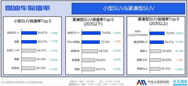 20万以下的紧凑型SUV市场中,保值榜冠军CR-V则因新款的上市,保值率在一季度直接跌了3.25%,丰田RAV4荣放则凭借一季度不错的全国二手车市场热度,保值率有所回升。