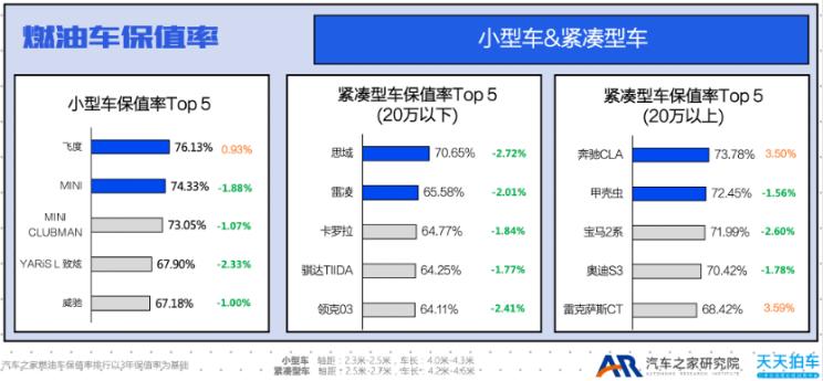 小型车榜单虽然整体有所下滑,但是飞度延续去年年末的回升态势,保值率提升了0.93%,继续牢牢占据最保值小型车的名号。