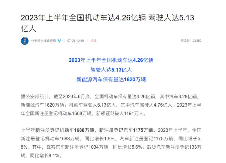 [本站 资讯]  日前,公安部交通管理局公布了2023年上半年国内机动车保有量、新能源车保有量等相关信息。据公安部统计,截至2023年6月底,全国机动车保有量达4.26亿辆,其中汽车3.28亿辆,新能源汽车1620万辆;机动车驾驶人5.13亿人,其中汽车驾驶人4.75亿人。2023年上半年全国新注册登记机动车1688万辆,新领证驾驶人1191万人。