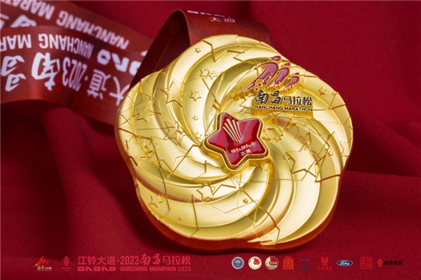 完赛奖牌则是由曾为上马、杭马、厦马设计奖牌的南昌籍著名设计师李淳设计,奖牌整体造型呈五角星旋转造型,以动感旋转的设计风格围绕五角星盘旋而上。奖牌正面以无数颗大小五角星汇聚红五星而成,寓意着聚是一团火,散是满天星。背面则是由滕王阁观一江两岸的视角,凸显南昌新老城市的日新月异变化。奖牌正反面的红五角星可以自行组装,五角星背面可以DIY刻跑者的名字,五角星一套五枚,同时今年的五角星也是号码簿扣,可以一物多用的使用。