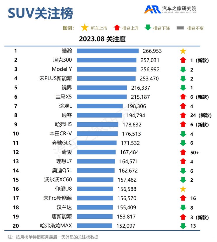 此外,还有坦克300、宝马X5、逍客、哈弗H5、仰望U8与唐新能源等新款车型发布后同样有着不俗的表现,本期关注榜单排名有着不同程度的提升。