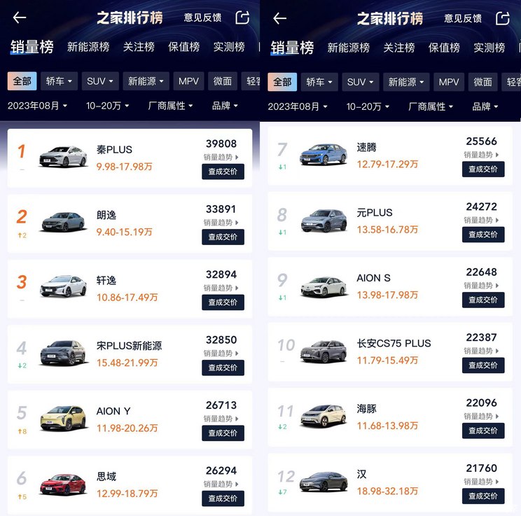 『10-20万元新车销量排名,新能源车占据一半席位』