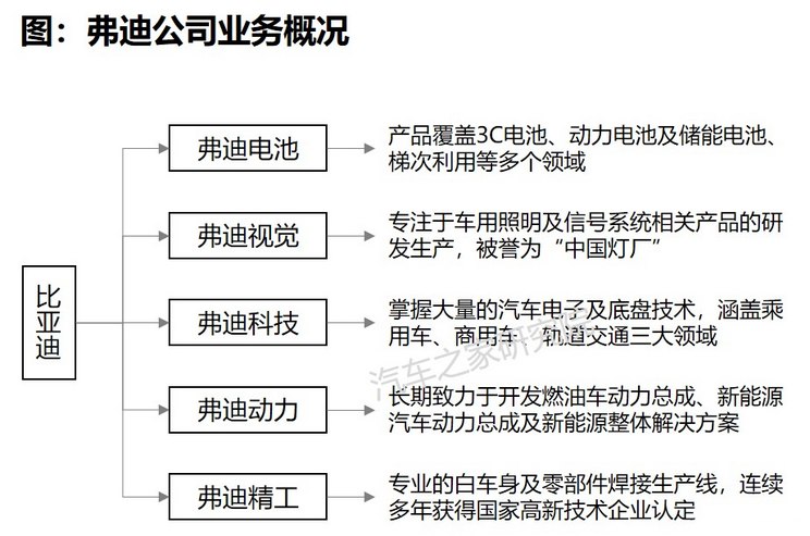 比亚迪旗下五家弗迪公司将核心零部件环节自主掌握,分别是弗迪电池有限公司、弗迪视觉有限公司、弗迪科技有限公司、弗迪动力有限公司、弗迪精工有限公司。独立的弗迪系公司将拥有更多的自主权,更有助于加快全球电动化的普及。