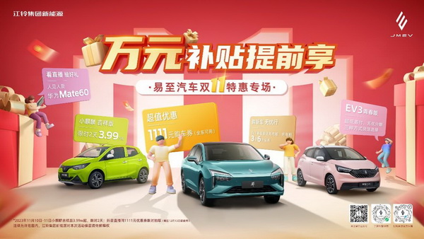 近日,江铃集团新能源开启“万元补贴提前享 易至汽车双11特惠专场”活动,带来一场无“折”学、不“套路”的购车狂欢,为关注易至EV3青春版、小麒麟吉祥版、羿等当红车型的消费者带来真正的优惠盛宴。