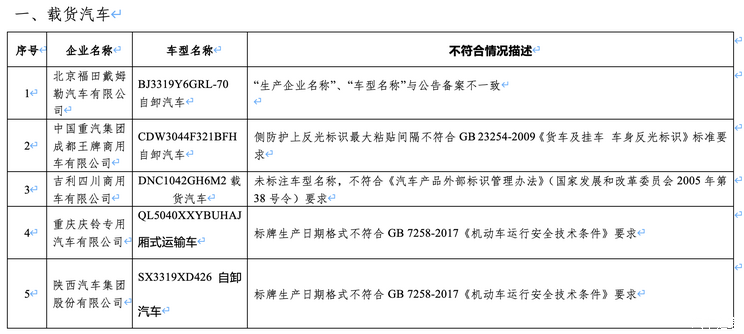 (二)传统载货汽车,共涉及5家企业的5个车型产品,涉及侧面防护装置、部件标记等项目不符合国家标准或管理规定。