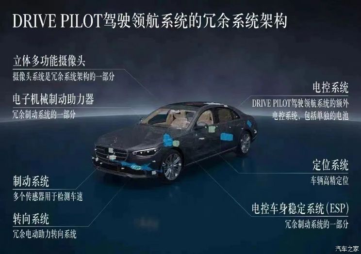 冗余系统则是L3级自动驾驶安全运行的关键要素。在搭载多个传感器的基础上,DRIVE PILOT驾驶领航系统根据有条件自动驾驶的安全需要,额外配备了传感器,包括:激光雷达、立体多功能摄像头、后置多功能摄像头和麦克风,以及车轮湿度传感器。选装该L3级系统的梅赛德斯-奔驰S级轿车和纯电EQS还配备转向、制动及车载电控的冗余系统,即使其中任何一个系统发生故障,汽车仍能保持机动性,并时刻确保可由驾驶员安全接管。目前,梅赛德斯-奔驰正加速推进L3级系统的优化,以期在本年代末可实现在高速公路上适用高达130公里/小时的速度。