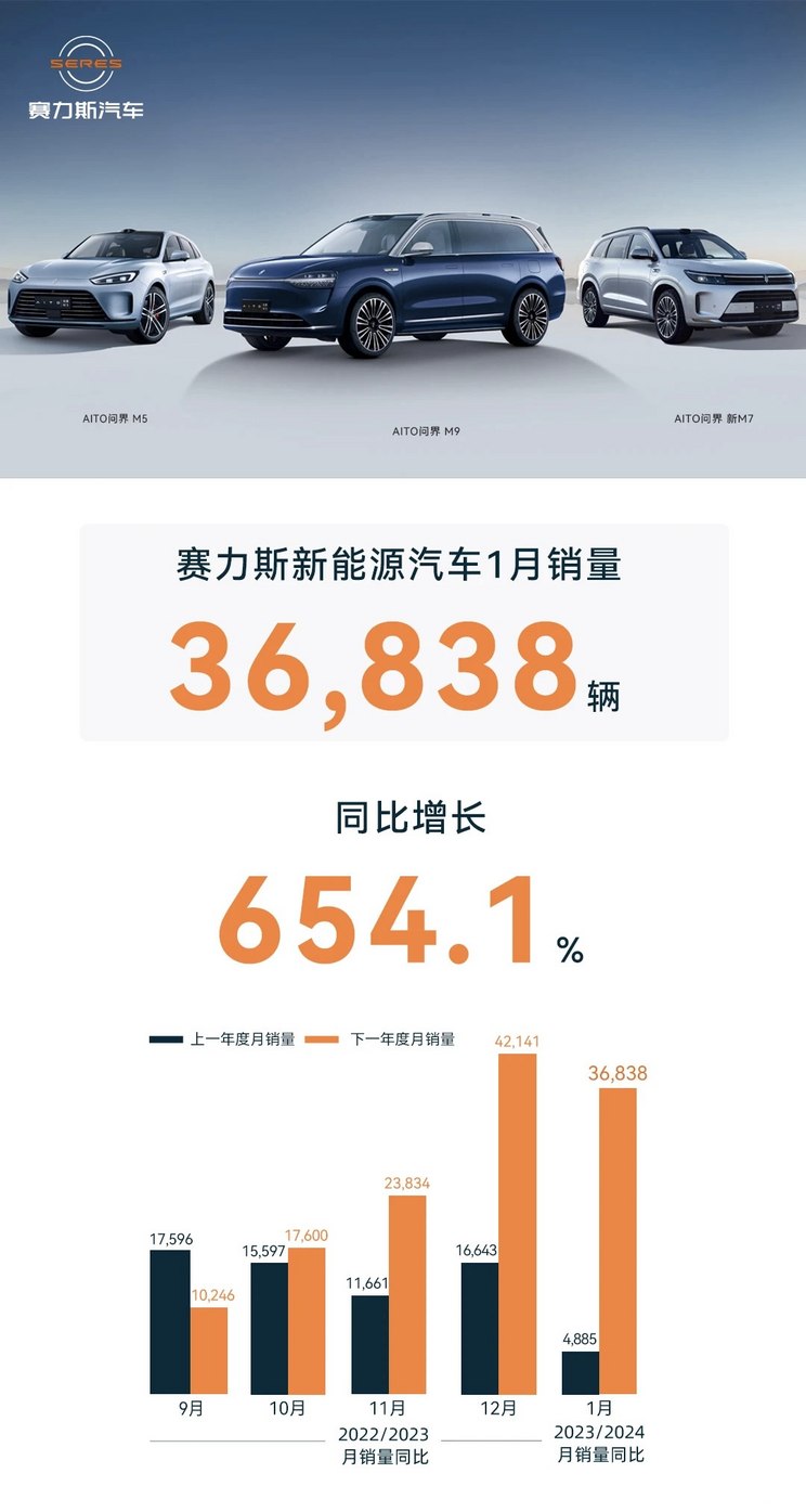 [本站 资讯] 2月1日,赛力斯集团股份有限公司(601127.SH以下简称“赛力斯”)发布2024年1月产销快报。数据显示,1月赛力斯新能源汽车销量达36838辆,同比增长654.10%;赛力斯汽车1月销量31017辆,同比增长590.80%。