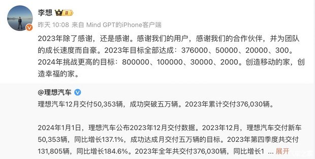 刚过了2024年,理想汽车CEO李想就发文称,理想汽车要挑战更高的目标:800000、100000、30000、2000。这些数字分别代表理想汽车2024年的全年销量目标是80万辆,月销量挑战10万辆,单车月销量冲击3万辆,超充站布局2000座。