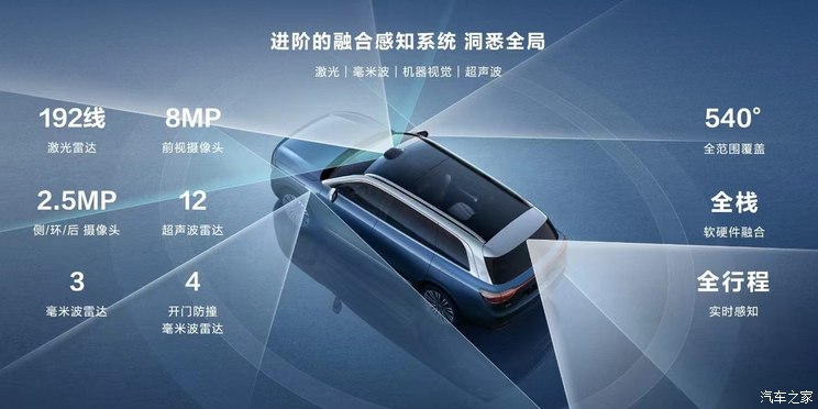 AITO问界M9搭载HUAWEI ADS 2.0高阶智能驾驶系统,搭载192线激光雷达,为业界车规级量产最高线数激光雷达,最远探测距离可达250m,较业界平均提升20%,点频达到184万点/秒,扫描频率达到20Hz。