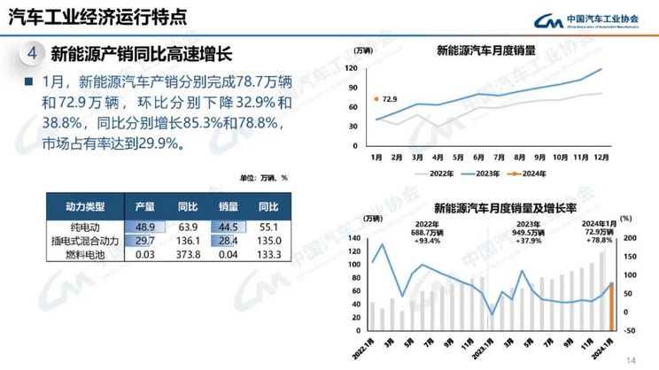 [本站 资讯] 据中国汽车工业协会统计,1月,汽车产销分别完成241万辆和243.9万辆,环比分别下降21.7%和22.7%,同比分别增长51.2%和47.9%。乘用车方面,产销分别完成208.3万辆和211.5万辆,环比分别下降23.2%和24.2%,同比分别增长49.1%和44%。由于1月相对年底冲量的12月是数据较低的月份,整体市场均出现了环比下降和同比增长的表现。