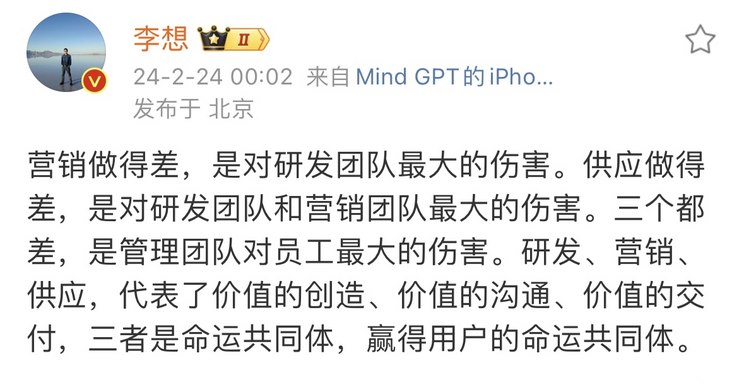 李想还表示,对于一个企业来说,营销做得差,是对研发团队最大的伤害。供应做得差,是对研发团队和营销团队最大的伤害。三个都差,是管理团队对员工最大的伤害。研发、营销、供应,代表了价值的创造、价值的沟通、价值的交付,三者是命运共同体,赢得用户的命运共同体。(编译/本站 秦超)
