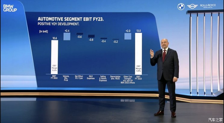 在汽车板块,华晨宝马运营业务的全面整合、更高的销量、有效的产品组合以及宝马M品牌份额的提升等原因,使2023年营收增长了7.0%,达到1322.77亿欧元(2022年:1236.02亿欧元/经货币换算影响调整后:+111.3%),售后业务营收也有所增加。由于来自人民币和美元的负汇率折算影响了营收增长:除去这些不利因素,全年收入大幅增长11.3%。