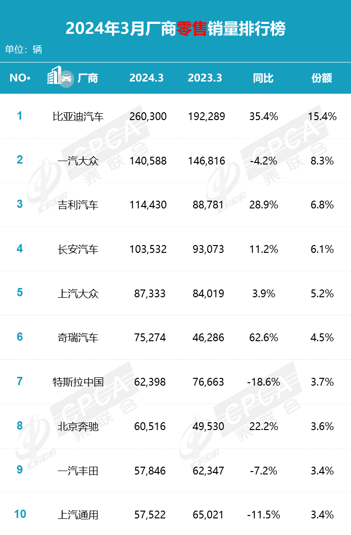 1-3月的具体品牌销量方面,比亚迪依旧包揽了零售销量、批发销量和新能源零售销量三项冠军,分别为586,006辆、624,398辆和586,006辆。第二名分别为一汽-大众、奇瑞和吉利,销量依次为395,266辆、510,324辆和137,452辆。(编译/本站 颜欢)