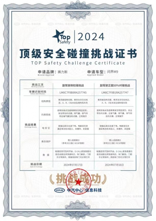 近日,在中汽中心最新C-NCAP公布的测评结果中,问界M9以93.9%的综合得分率刷新C-NCAP纪录,成为唯一超五星安全认证车型。不仅如此,问界M9还参与了TOP Safety行业首次副驾驶侧双项安全测试,并以卓越表现荣获顶级安全碰撞挑战成功认证。连续两次行业权威测试,彰显出问界M9领先不止一代的硬核安全,同时更标志着赛力斯汽车重塑中国新豪华品牌安全新标杆,引领行业进入智能安全时代。