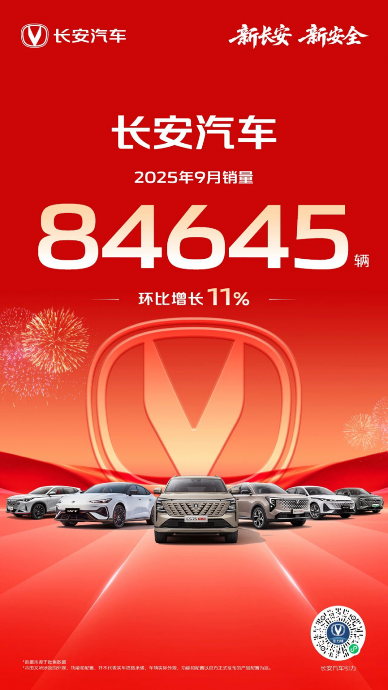 (导语) 10月9日,长安汽车发布最新销量快报。数据显示,2025年9月,长安汽车以整体84645辆的市场表现,迎来了11%的环比增长,长安新能源起势,燃油基盘稳健!其中长安汽车的CS75系列、逸动系列、CS55系列、UNI系列等热销爆款产品的市场表现依旧强势。