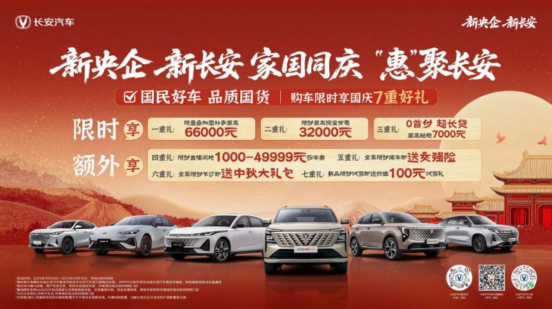 在产品持续畅销的同时,长安汽车还始终坚持以实际行动回馈广大用户,近期更是发起了“新央企 新长安 家国同庆 ‘惠’聚长安”活动。在10月1日至10月12日期间,用户下订长安汽车榜单好车,限时享限量叠加国补至高66000元、限时至高现金优惠32000元等多重福利,额外享限时直播间1000-49999元购车券、新品限时试驾即送价值100元试驾礼等7重好礼!