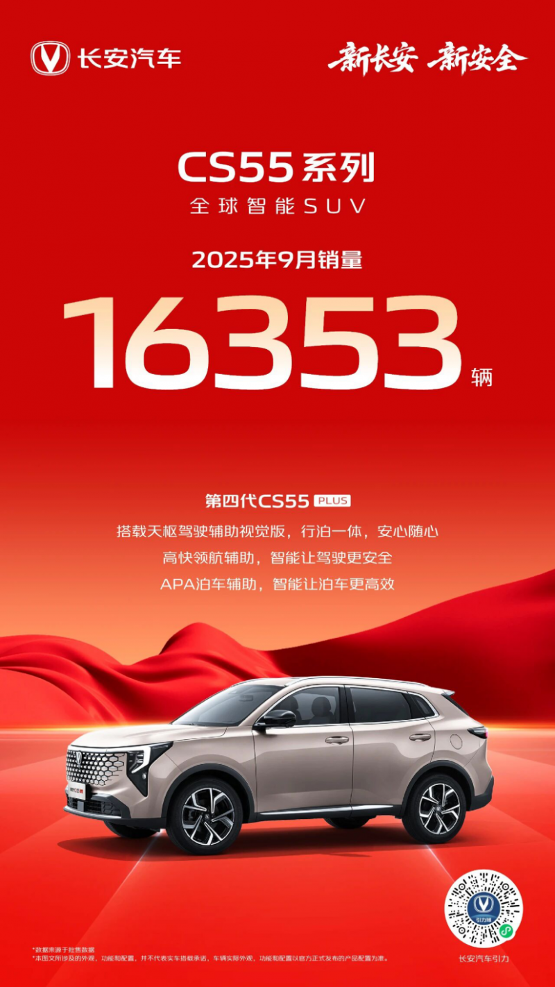 9月,长安CS55系列单月销量破万,达到了16353辆。尤其是第四代CS55PLUS上市后,这款“全球智能SUV”,正凭借再上台阶的领先产品力,在2025年以月均销量破万的耀眼表现,续写着 “百万用户优选爆款SUV”的新传奇。