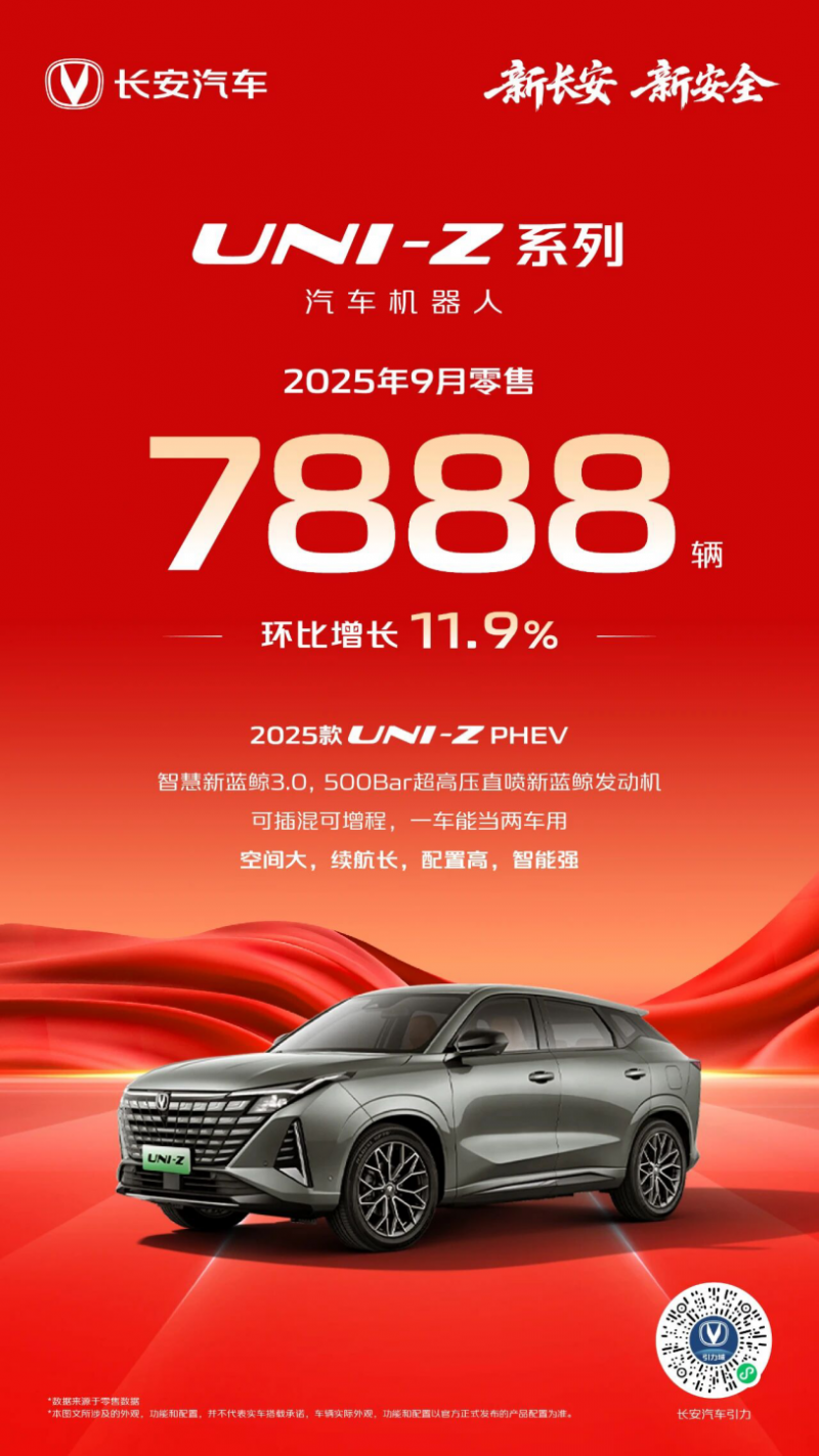 长安UNI-Z系列在今年焕新推出了2025款UNI-Z PHEV和2025款UNI-Z新蓝鲸,以好看、好开、好省、好聪明的进阶产品力,进一步满足了用户对高品质出行的需求。双动力新车助推下,长安UNI-Z系列不但荣获J.D.Power2025年度“中国新能源汽车紧凑型插电混动SUV第一名”的荣誉,还在9月交出了零售7888辆、环比增长11.9%的亮眼成绩。