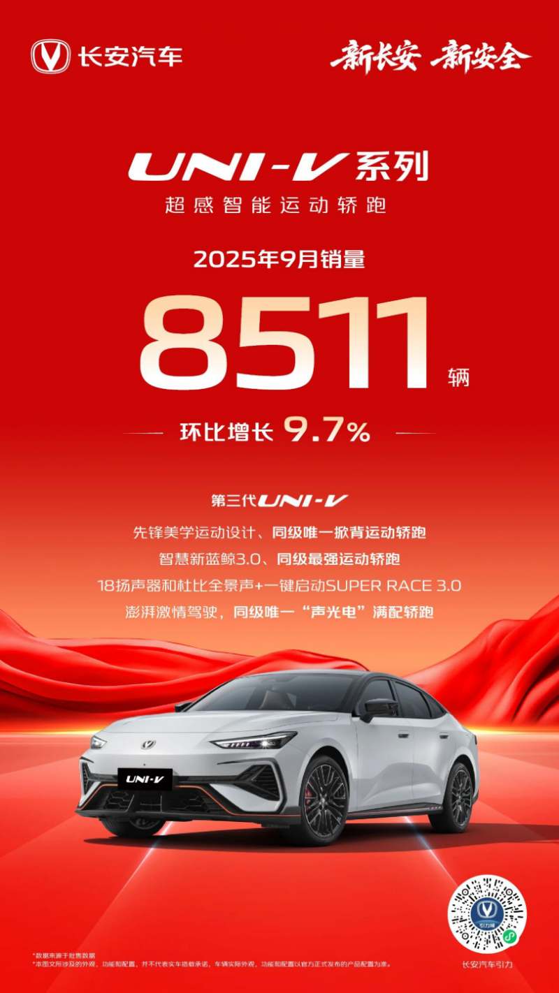 在9月的轿跑市场,长安UNI-V依然令人瞩目,交出了销售8511辆、环比增长9.7%的市场成绩。增长的关键在于新上市的第三代UNI-V,这款“超感智能运动轿跑”搭载多项领先技术,以超颜设计、超动智擎、超智座舱三大优势,满足了用户对一台优秀运动轿跑的所有想象!
