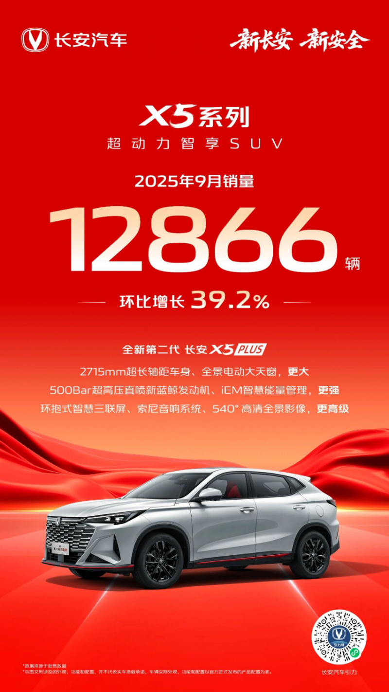 8月2026款第二代X5PLUS正式上市,这款“超动力智享SUV”凭借智慧新蓝鲸3.0和30英寸三联屏+索尼音响、2715mm轴距超大空间等优势,迅速得到了用户的认可,并助推长安X5系列在9月迎来了39.2%的环比增长,交出了单月销量12866辆的抢眼表现。