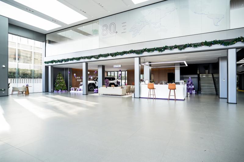 体验中心外立面采用极简大气的设计语言,搭配银灰色蜂窝铝板与超白钢化玻璃幕墙,既彰显硬派越野的力量感,又透过多元材质的碰撞营造现代通透的视觉体验,与纵横“从容自信,追求极致,勇于探索,无畏坚韧”的精神高度契合。
