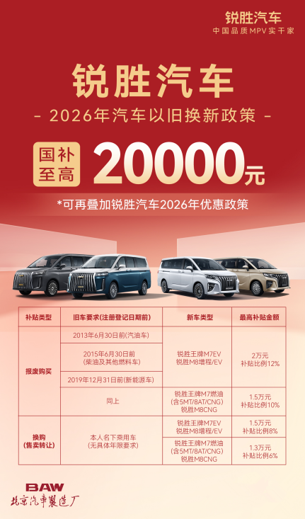 随着2026年国家汽车以旧换新政策的深入推进,消费者购车迎来新一轮红利期。锐胜汽车积极响应政策号召,结合品牌年终购车补贴,为旗下全新车型——锐胜M8推出“以旧换新+六重新春专属购车礼”双重优惠体系,助力消费者以更优成本入手全场景舒享大型MPV,从容迎接新年出行升级。