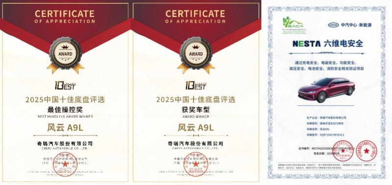 在权威奖项层面,风云A9L于2026年2月斩获第六届中央广播电视总台《汽车风云盛典》“风云2025主题车”国家级荣誉,这是对其全维安全实力的最高认可。技术层面,车型凭借鲲鹏超能电混发动机获中汽研“能耗之星”认证,同时斩获“中国十佳底盘”与“最佳操控奖”双项大奖;安全领域通过NESTA六维电安全认证,并获“零甲醛”汽车认证;品质方面则揽获OEKO-TEX®生态纺织品认证、低风噪汽车认证及2025华舆奖年度智能座舱典范等多项殊荣。奖项、口碑、销量的三重丰收,让风云A9L成为20万级轿车市场当之无愧的“奖项收割机”与“价值标杆”。