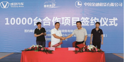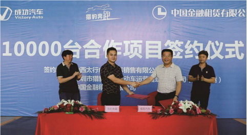 8月4日下午,成功汽车与猎豹奔跑、铁骑速运签约仪式在山西太行成功汽车销售公司举行,此次签约仪式上成功汽车分别与猎豹奔跑、铁骑速运各签订了5000台成功V2E电动汽车大单(共计6亿元),成功汽车事业部高利平副总经理、中国金融租赁有限公司陈总经理出席并见证了此次签约仪式。