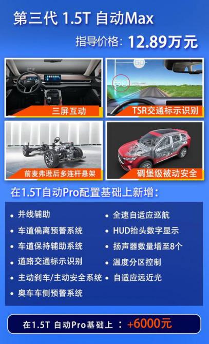 计算车型:第三代哈弗H62021款 1.5T Max,厂商指导价是12.89万元。作为全系的次顶配车型,其配备了全速ACC自适应巡航、车道保持辅助等诸多驾驶辅助配置,而双区自动空调、自适应远近光等实用性配置也都有出现。