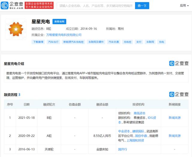 [本站 资讯] 5月17日,万帮能源&星星充电宣布获得高瓴领投、IDG、泰康、宝龙与远洋地产等跟投的B轮融资,投后估值155亿。