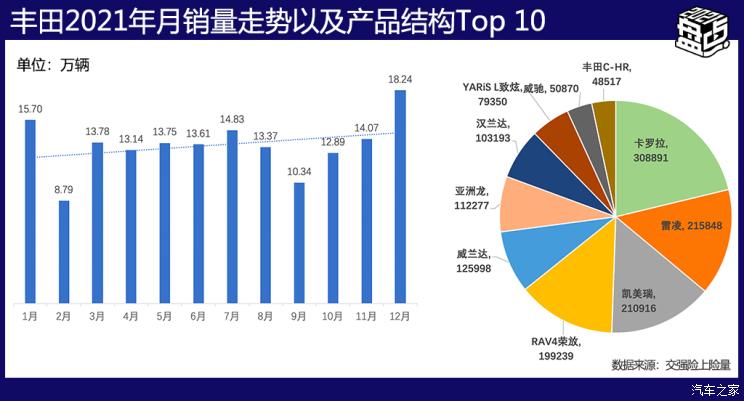 2021年对于丰田来说,是稳扎稳打的一年。全年销量表现上并不突出,但也基本维持了去年的水平。相比德系的大众品牌,已经是不错的成绩。从全年各月份表现来看,传统的“金九银十”并没有给丰田带来太多增量,反倒是普通的1月、7月以及12月有着不错的表现,尤其是12月份达到了2021年的峰值,单月销量18.24万辆。