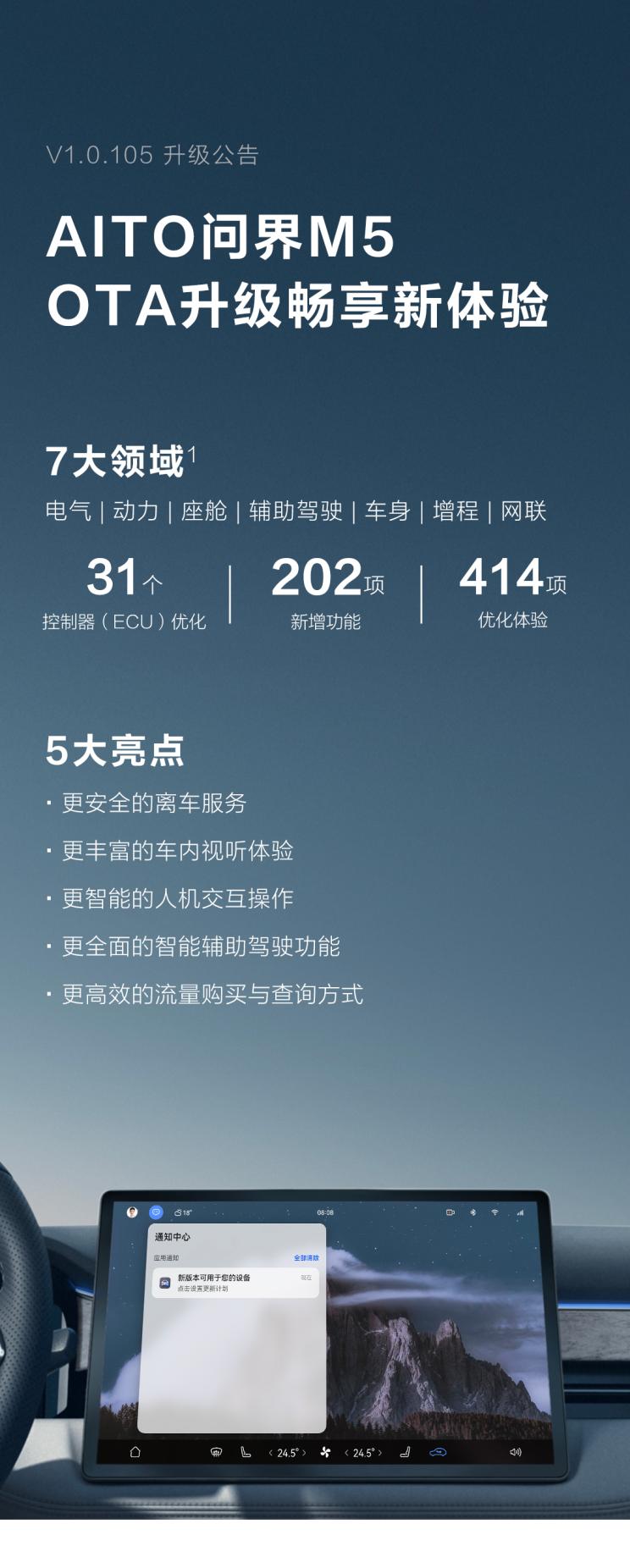 [本站 资讯] 日前,AITO问界发布了最新的OTA升级公告,即将升级的是V1.0.105版本,在电气、动力、座舱等7大领域升级,新增202个功能点、优化414项体验,整体变化不小,接下来就让我们一同来看看。