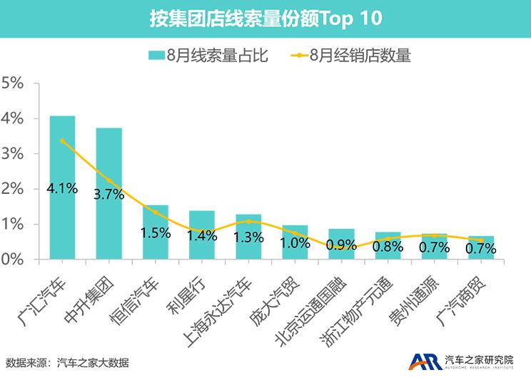 整体来看,集团店线索量占比有所提高,环比增长0.59个百分点至48.9%。排名前十的集团店线索量占比为16.0%,提高0.2个百分点,整体上趋于集中化。线索量排序上,集团店线索量占比前十名次序较7月没有发生改变,各集团店占比基本稳定。