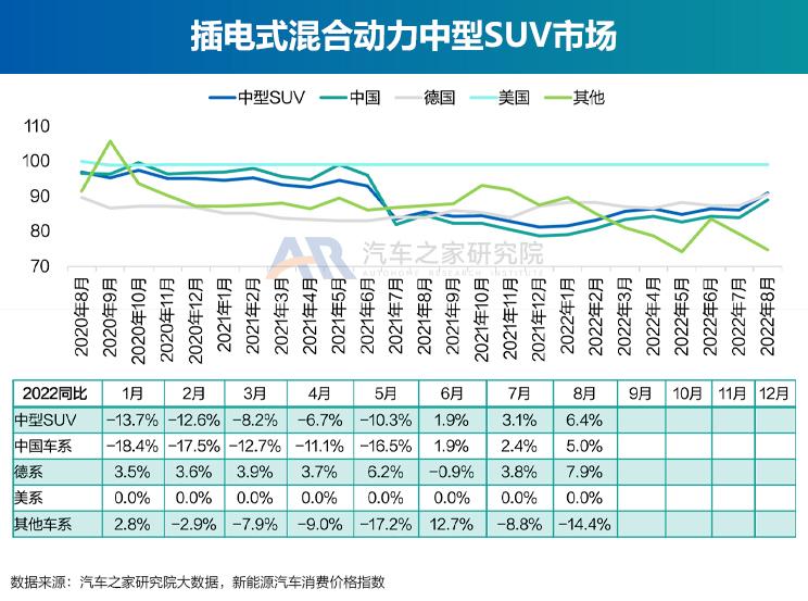 8月,插电式混合动力中型SUV市场的价格指数为91.07,同比上涨6.44%,环比上涨5.71%。分国别看,除美系持平以外,中国车系(+6.0%)、德系(+3.7%)上涨,其他车系(-5.5%)下跌。细分市场整体均价为28.18万元,较去年同期涨3.88万元,较上月涨1.52万元;中国车系28.28万元、德系24.54万元、美系31.04万元、其他车系38.34万元。