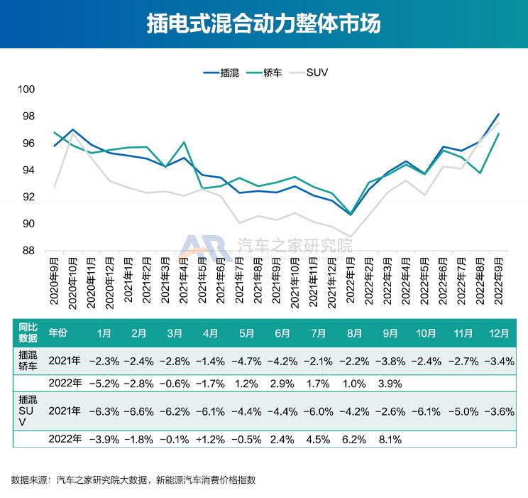 9月,插电式混合动力市场的价格指数为98.20,同比上涨6.35%,环比上涨2.15%,细分市场整体均价为20.66万元,较去年同期跌2.63万元,较上月涨4300元。其中,插电式混合动力轿车市场价格指数为96.74,同比上涨3.91%,环比上涨3.15%;细分市场整体均价为20.09万元,较去年同期涨2300元,较上月涨6100元。插电式混合动力SUV市场的价格指数为97.55,同比上涨8.05%,环比上涨1.44%,细分市场整体均价为21.08万元,较去年同期跌4.50万元,较上月涨3000元。