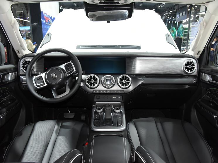 内饰参考现款车型,整体设计理念遵循了硬派越野的风格,大面积的方直轮廓线条搭配圆润的倒角,此外圆型空调出风口和圆形功能旋钮配以方菱形缝线内饰板,搭配起来更有质感。同时,新车还配有12.3英寸双联屏等,又增加了该车的科技感。