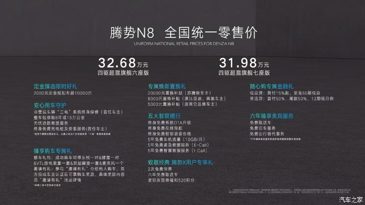 [本站 新车上市] 2023年8月5日,腾势N8迎来正式上市,新车共推出2款车型,售价区间为31.98-32.68万元。新车采用家族式设计语言进行打造,拥有较高的辨识度。作为一款中大型SUV,新车提供6/7座两种座椅布局。此外,腾势将会在三年内推出七款产品,除了现有的三款外,还有两款SUV――N8 MAX以及N9,N8 MAX的轴距达到了3.05米,N9的轴距达到了3.1米,两款新车有望2024年年底发布。据此前消息,腾势也会推出两款轿车,分别是类似保时捷Panamera车型的轿跑,预计2024年年中发布;以及与奔驰S级定位近似的行政座驾。
